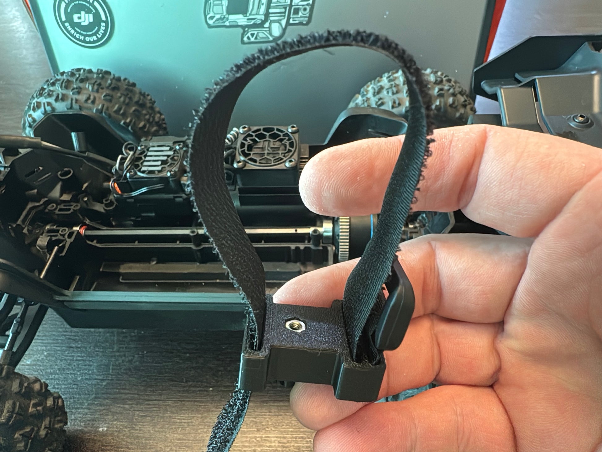 Instead of being locked into one battery size, this setup allows you to secure your battery with a Velcro strap, giving you real adjustability and flexibility.