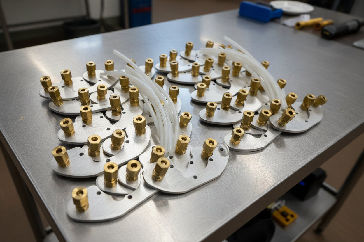 The dual carb throttle cable bracket is designed to provide a routing system for a single throttle cable to operate both carbs. You'll receive 2 brackets, 4 fittings, and approximately 6" of cable house (while cable housing supplies last)